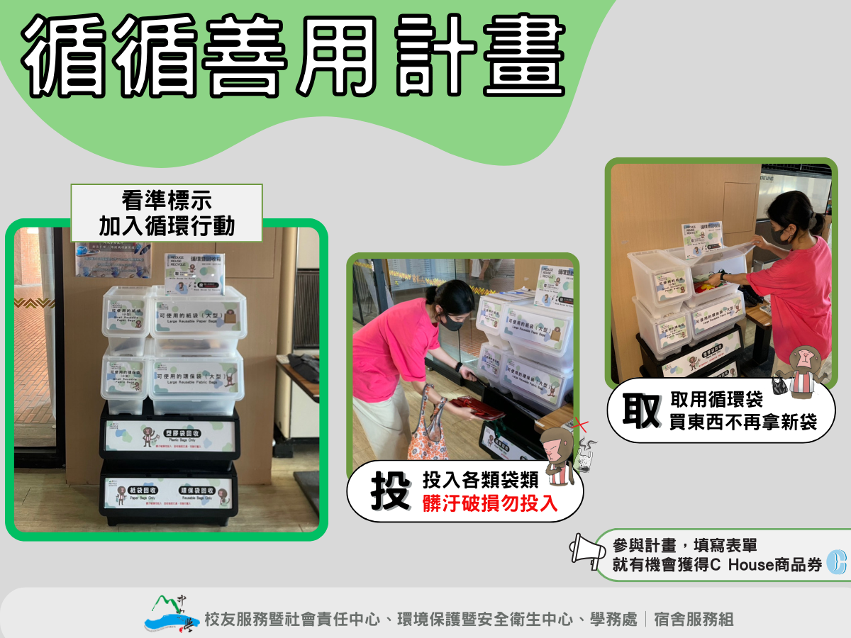 (中文) 「循循善用計畫」透過設置袋類回收循環箱,鼓勵師生將沒在使用的乾淨袋子(如塑膠袋、紙袋等)捐出,經過團隊整理與清潔後,再放入循環箱,讓有需求者自由取用。我們期望透過標準化的作業流程,不僅降低使用者的顧慮,也確保資源能夠有效循環再利用,落實環境永續的理念。