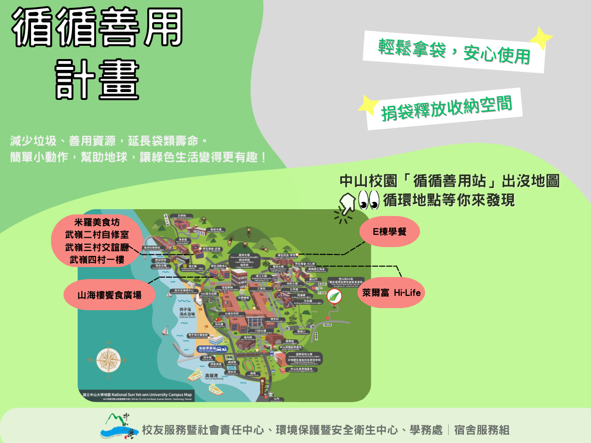 回到校園內,雖然有明確禁止銷售單位提供塑膠袋,但師生在外部採買或使用外送平台時,仍無法避免拿取一次性袋子,導致大量塑膠袋閒置無法有效利用,直接丟棄又增加垃圾來源。為此,中山大學校友服務暨社會責任中心攜手環安中心及學務處宿服組,共同推動「循循善用計畫」,透過循環機制延長這些購物袋的使用壽命。