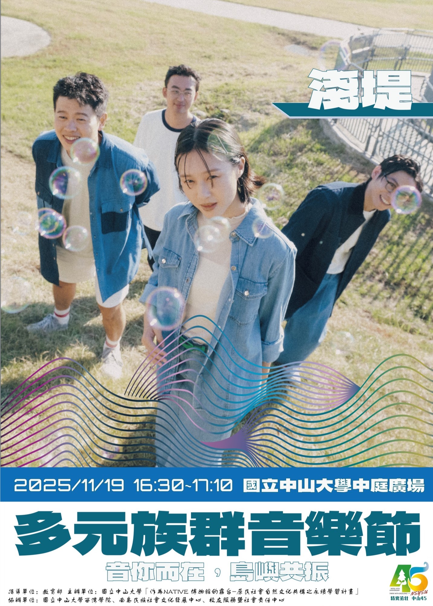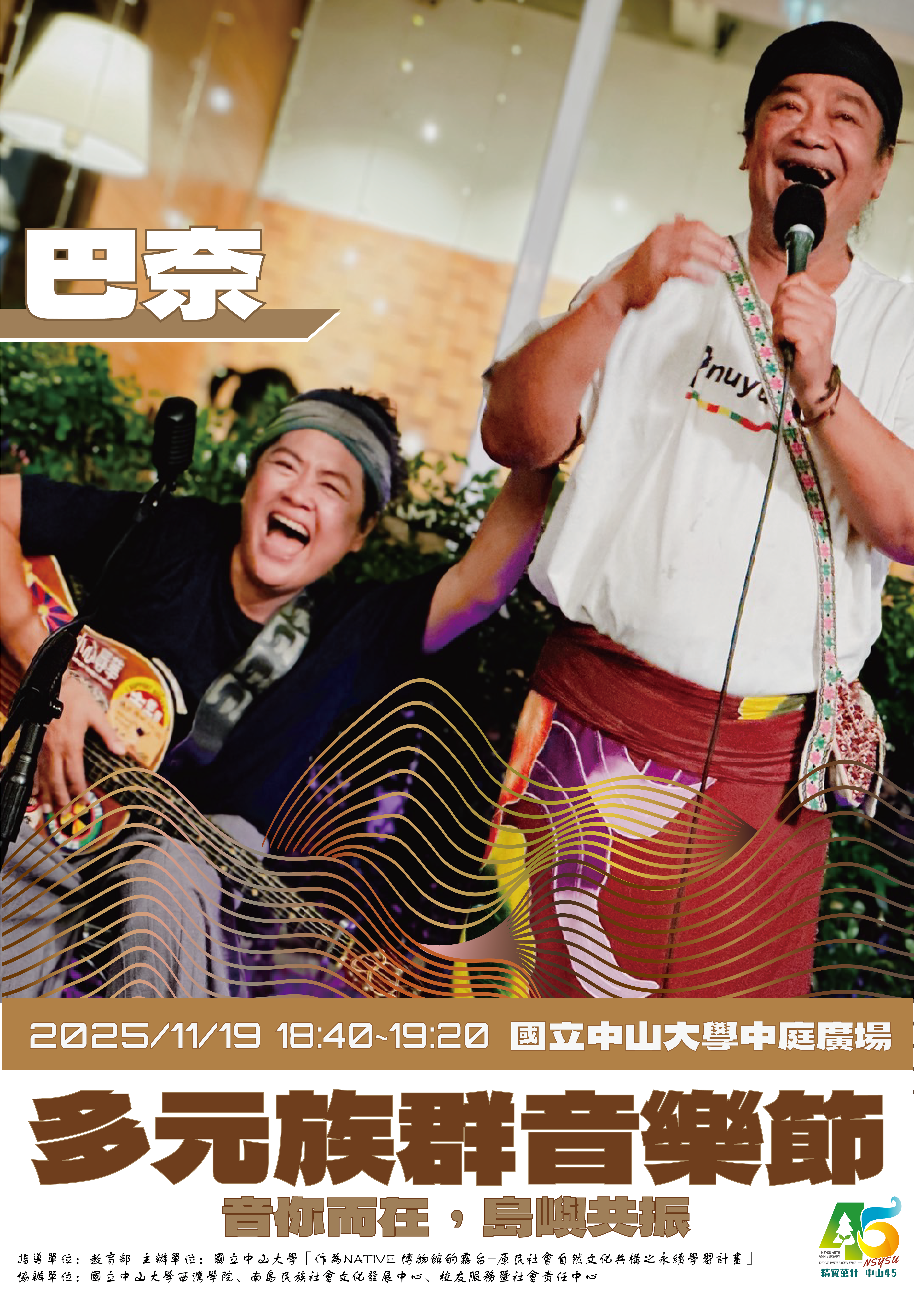(中文) 創作人透過歌詞訴說理念,譜寫旋律抒發情感。音樂多元的表現形式打破族群的藩籬,創造共同語言與情感記憶。本次〈多元族群音樂節〉邀請四組風格截然不同的音樂人進入校園,相異的身份認同及成長背景皆反映在各自的作品中。讓我們藉著音樂,享受族群共融的夜晚!