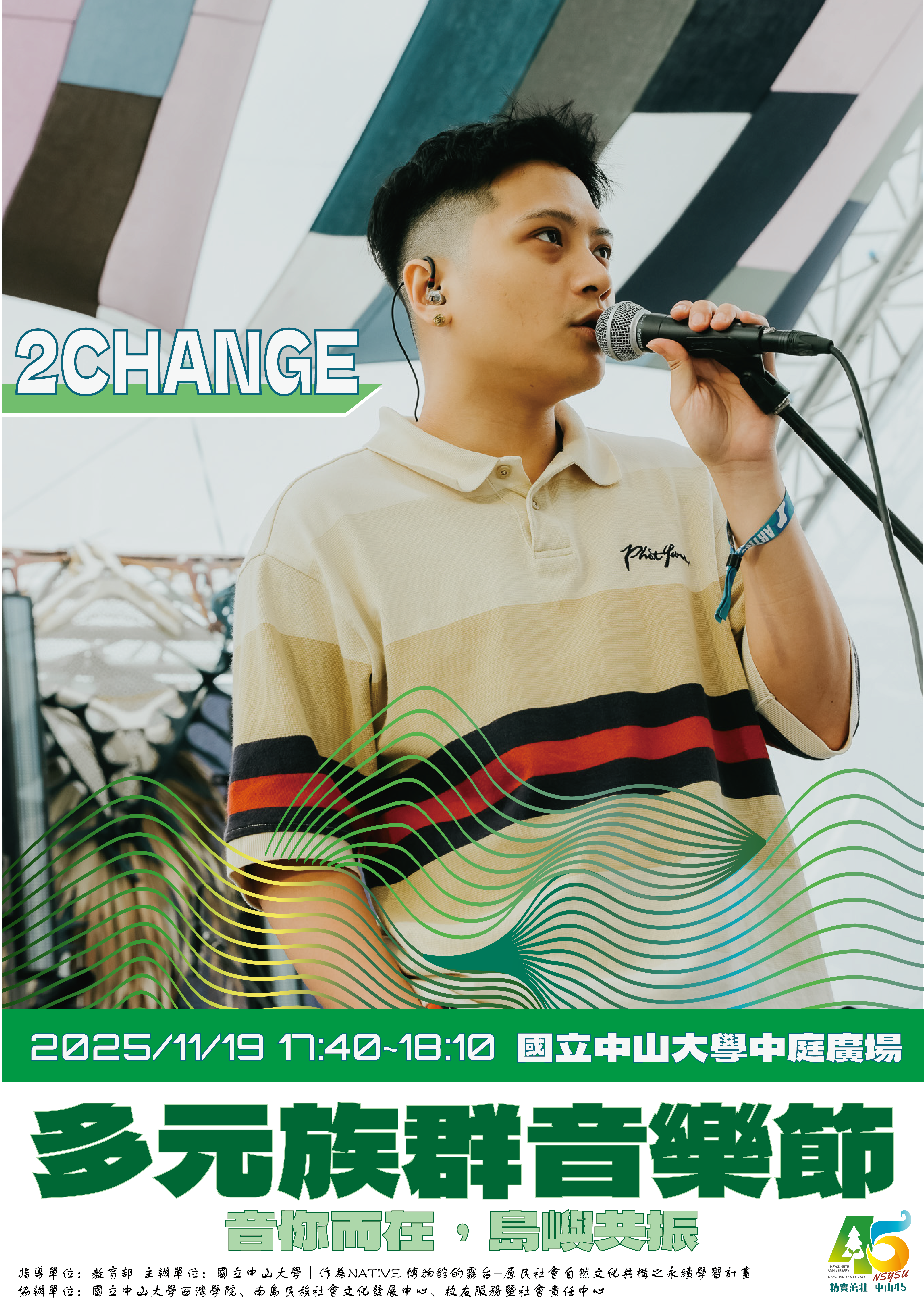學院派饒舌新星,流著泰雅與布農血脈,都市原住民的身份與嘻哈文化碰撞出專屬2CHANGE的Flow。獨特的成長經驗,身份認同的矛盾,都化為他創作的養分。個人首張專輯《THE ONE GOT C.H.A.N.G.E.s.》,將族語巧妙的融入詞曲節奏,寫出當代原民青年的生命故事與反思。