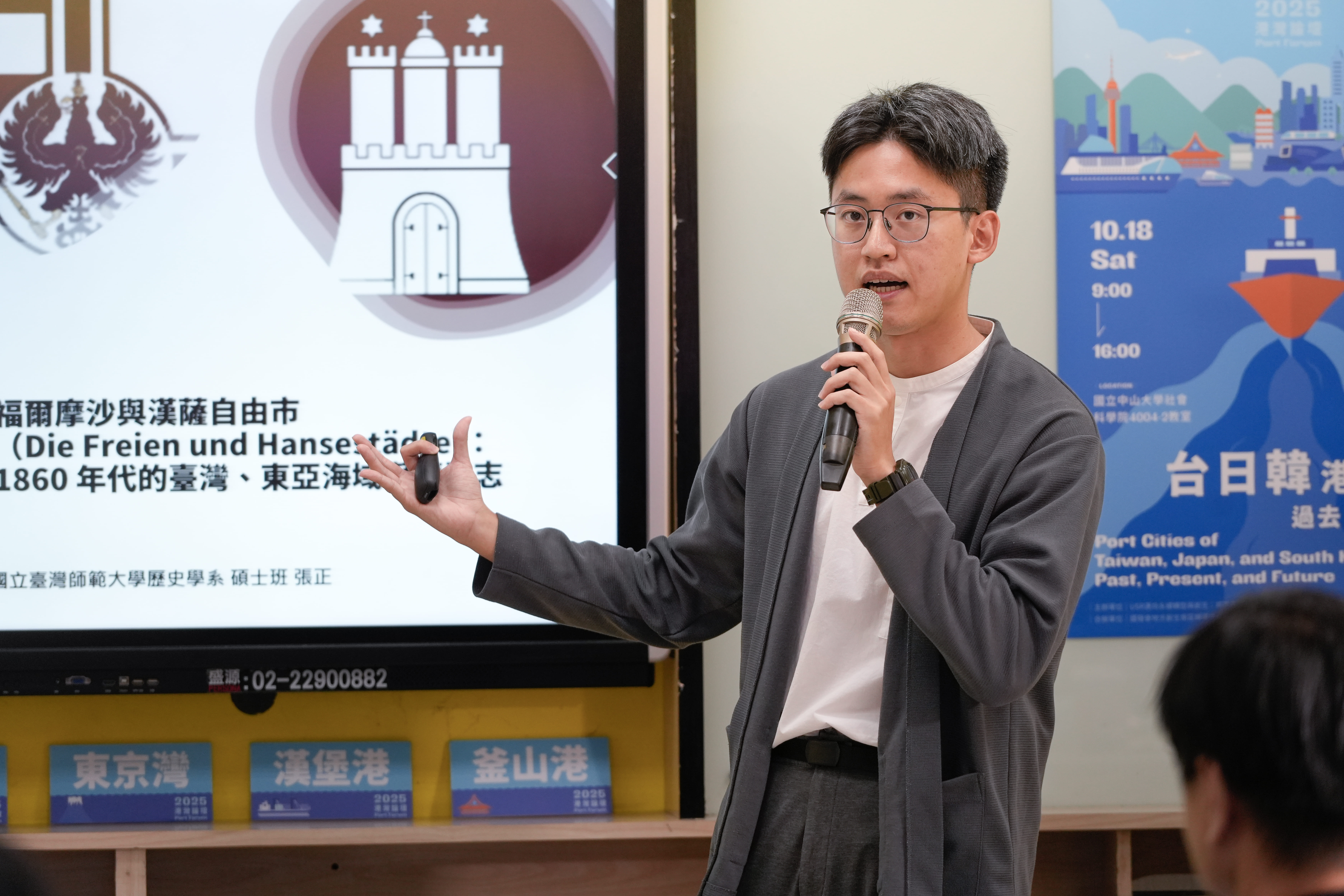 最後壓軸場由國立臺灣師範大學歷史學系碩士生張正分享〈福爾摩沙與漢薩自由市(Die Freien und Hansestädte):1860年代的臺灣、東亞海域與德意志〉。1860年代臺灣開港後,來自德意志邦國,特別是漢薩自由市(漢堡、布萊梅或呂貝克)的船隻貿易量僅次於英國。張正以漢堡與普魯士檔案為核心,探討漢薩商人及領事在臺活動,尤其淡水港領事報告,詳述地方官態度、貿易與樟腦政策等。這些檔案揭示漢薩市政府透過領事網絡建立對臺認識,也反映清帝國、普魯士與漢薩的外交競合,領事美利士除觀察臺灣社會經濟外,亦涉入樟腦貿易與開墾,引發三方外交爭議,展現德意志與東亞互動的歷史圖像。