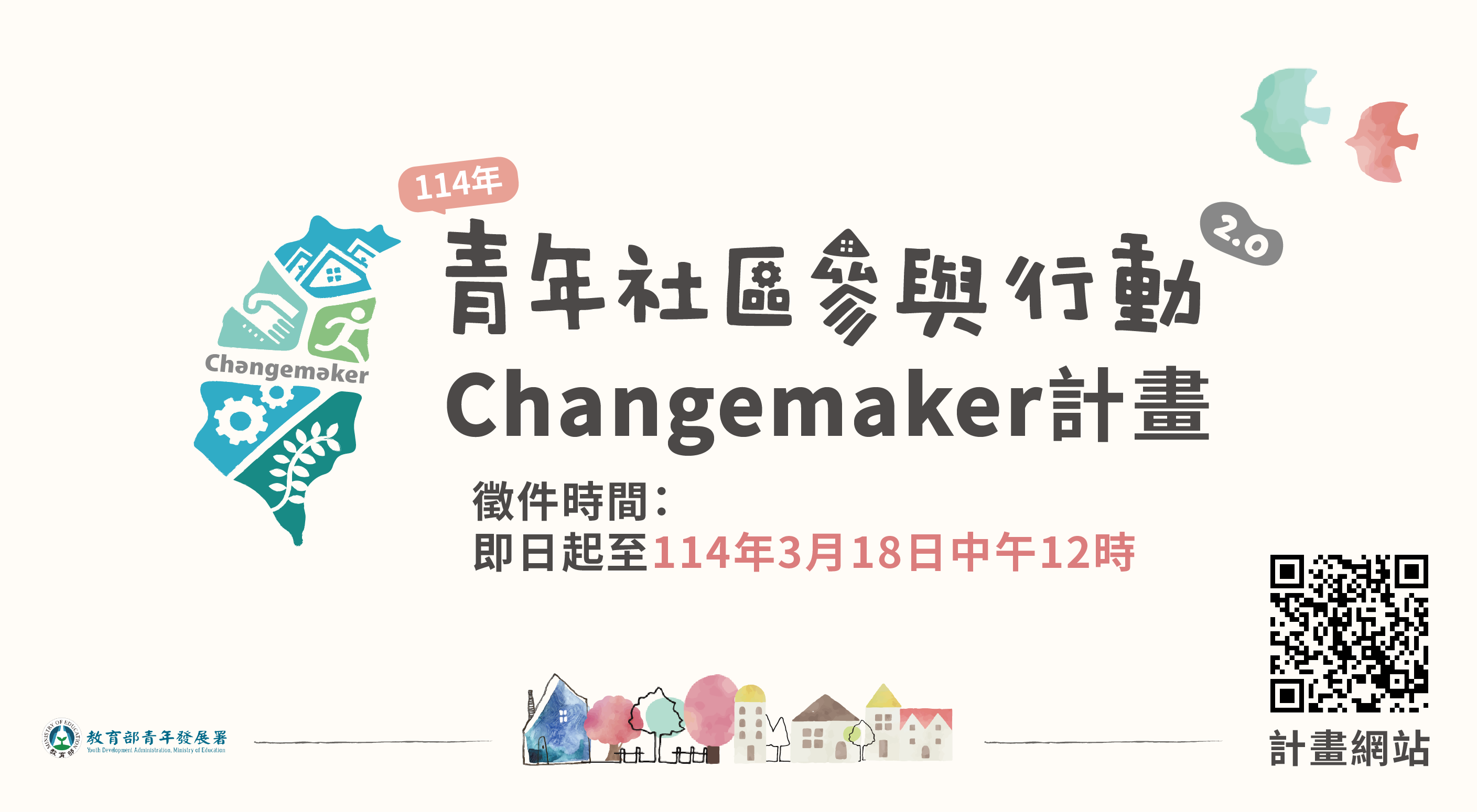 (中文) 為了讓更多關心社區、社會議題之青年有機會深入在地,將自己的觀點、專長、創意與熱情轉化為實際參與,教育部青年發展署持續辦理「114 年青年社區參與行動 2.0 Changemaker 計畫」,鼓勵青年組成團隊,針對家鄉、生長土地及關心的社區,提出行動計畫,陪伴青年從「如何認識自己」、「如何了解地方」及「如何在地行動」等,並連結部會相關資源,共同協助青年逐步從 Dreamer(青年夢想家)至 Actor(青年行動家),最後成為 Changemaker(青年翻轉家)。