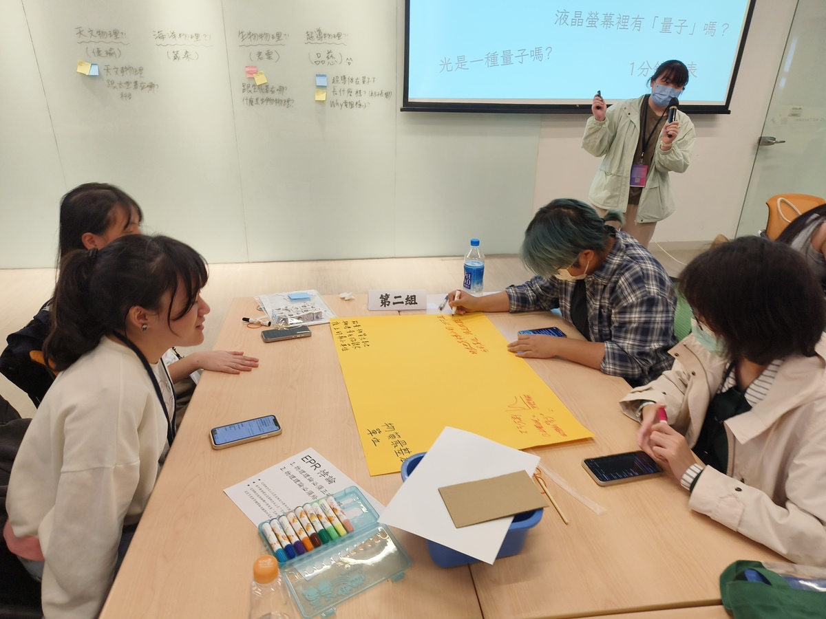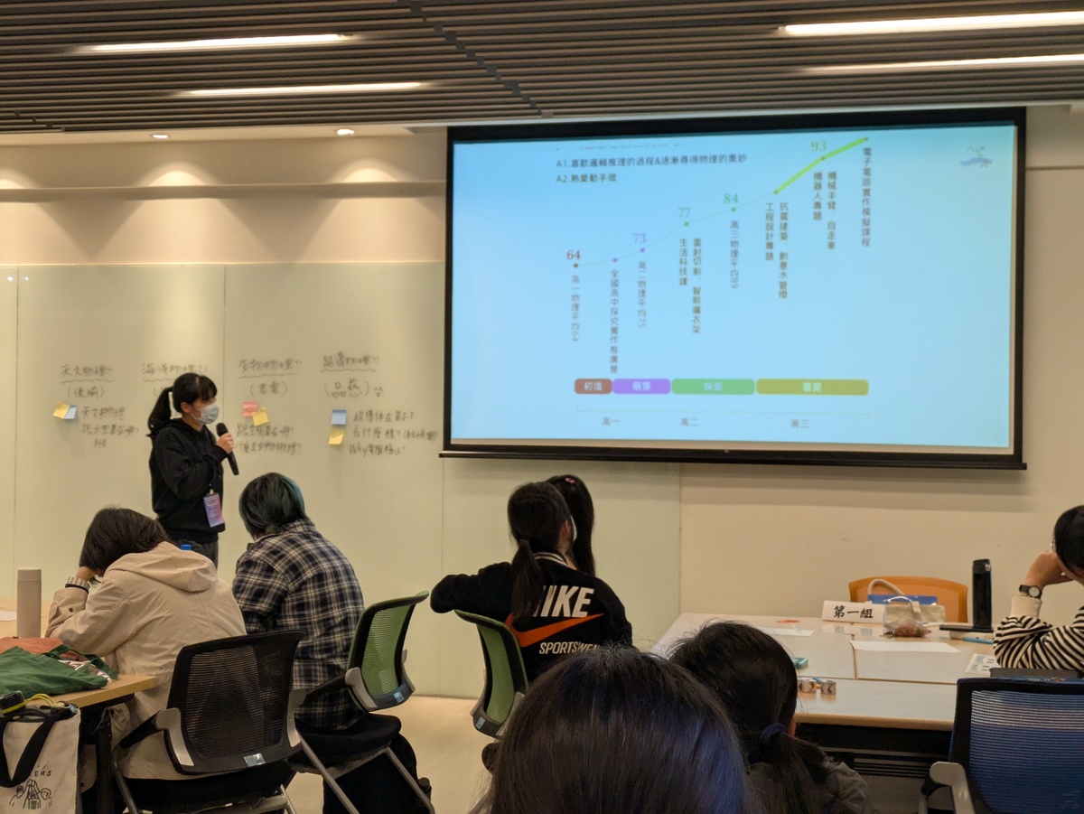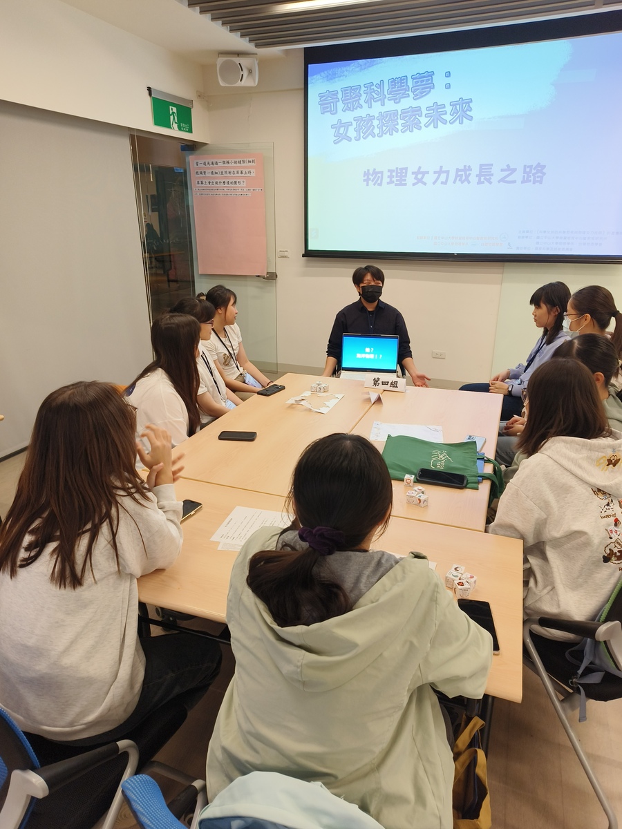 在大學生與研究生的學思歷程分享中,四位研究所及學士班高年級學生以小組方式與高中生近距離對話,領域上至天文、下至海洋;微如超導、廣如生物,除了與高中生分享研究的熱忱,也鼓勵高中生豐富對物理研究的想像。分享中學員們也針對物理知識、大學專業課程、科系差異、家庭背景等提出問題,互相交流討論。