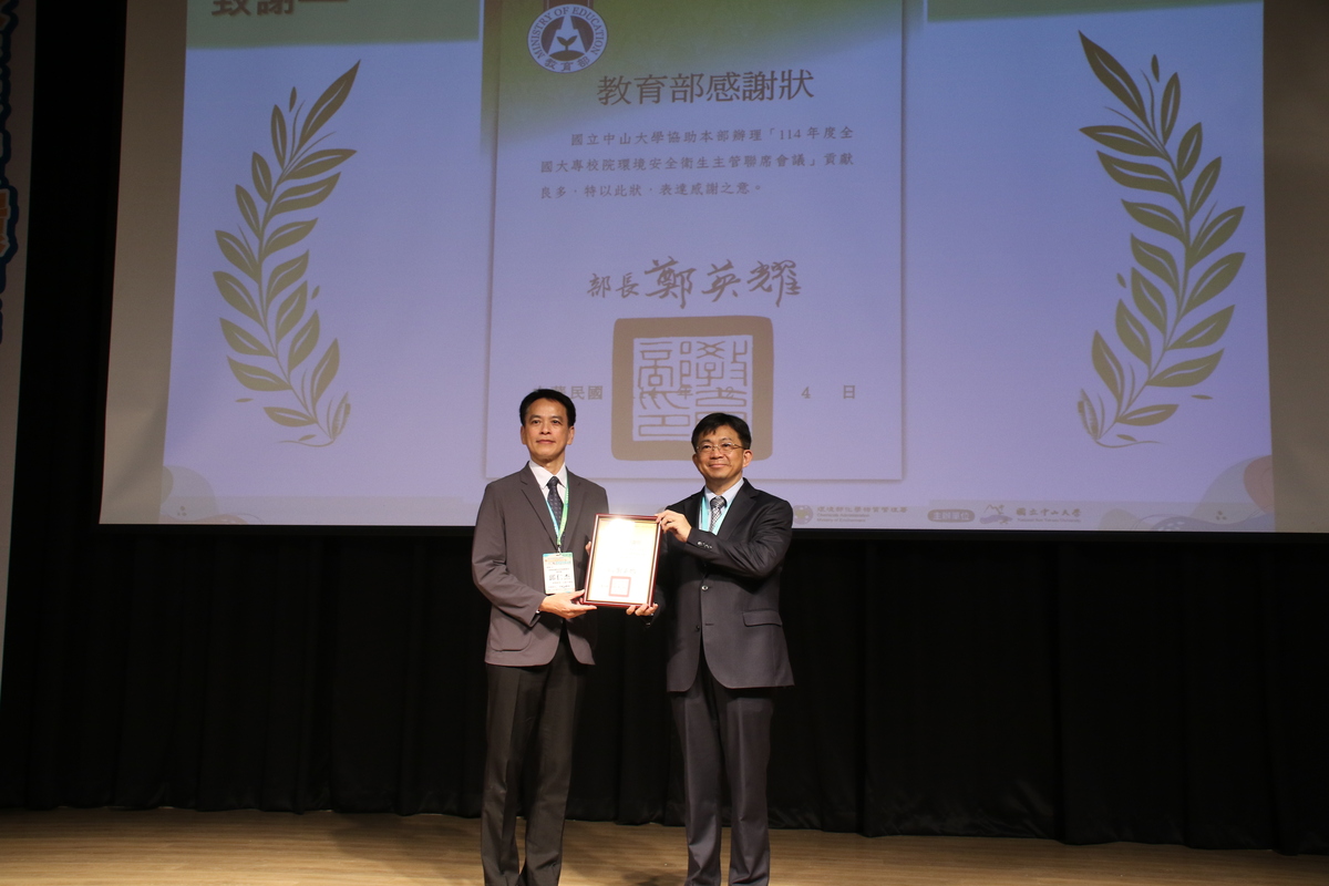 教育部資訊及科技教育司副司長邱仁杰頒發感謝狀予中山大學校長李志鵬(右)