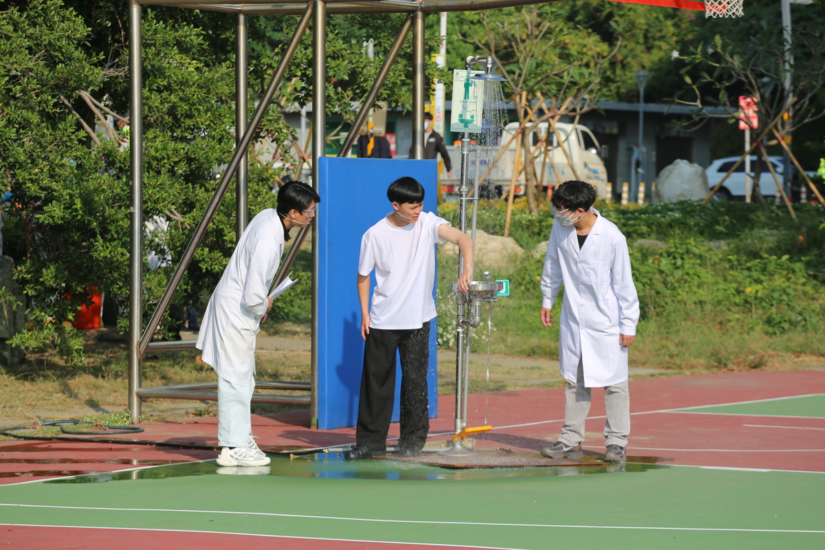 為增進校園在化學物質事故的應變能力,今年特別加碼舉辦「實驗室意外事故處理演練」。由中山大學環安中心、總務處、學務處同仁及環工所學生共同示範,模擬廢液處理與氫氟酸操作時的突發事件,呈現正確第一線應變方式,讓參與師生透過「看得見的教學」強化實驗室安全知識。