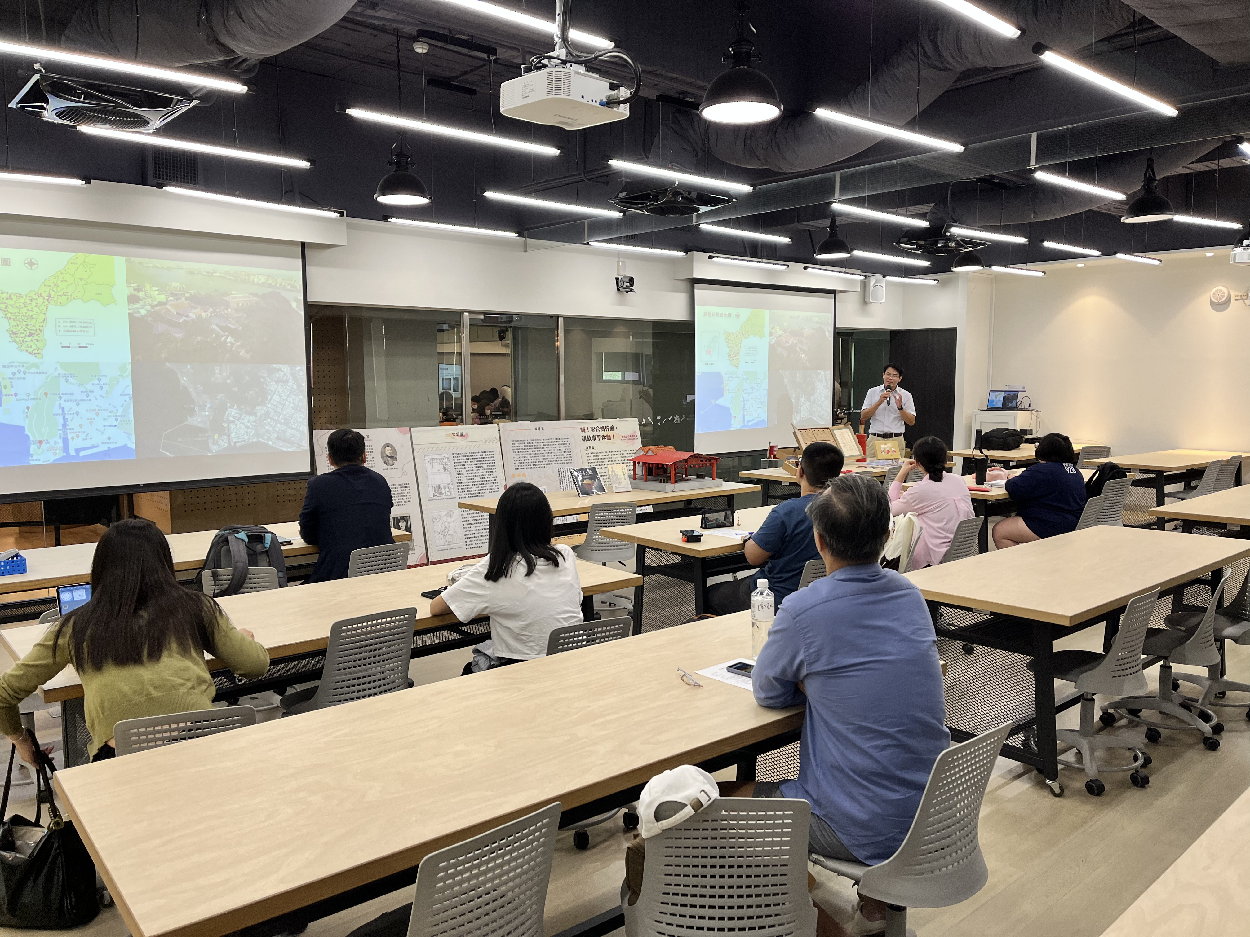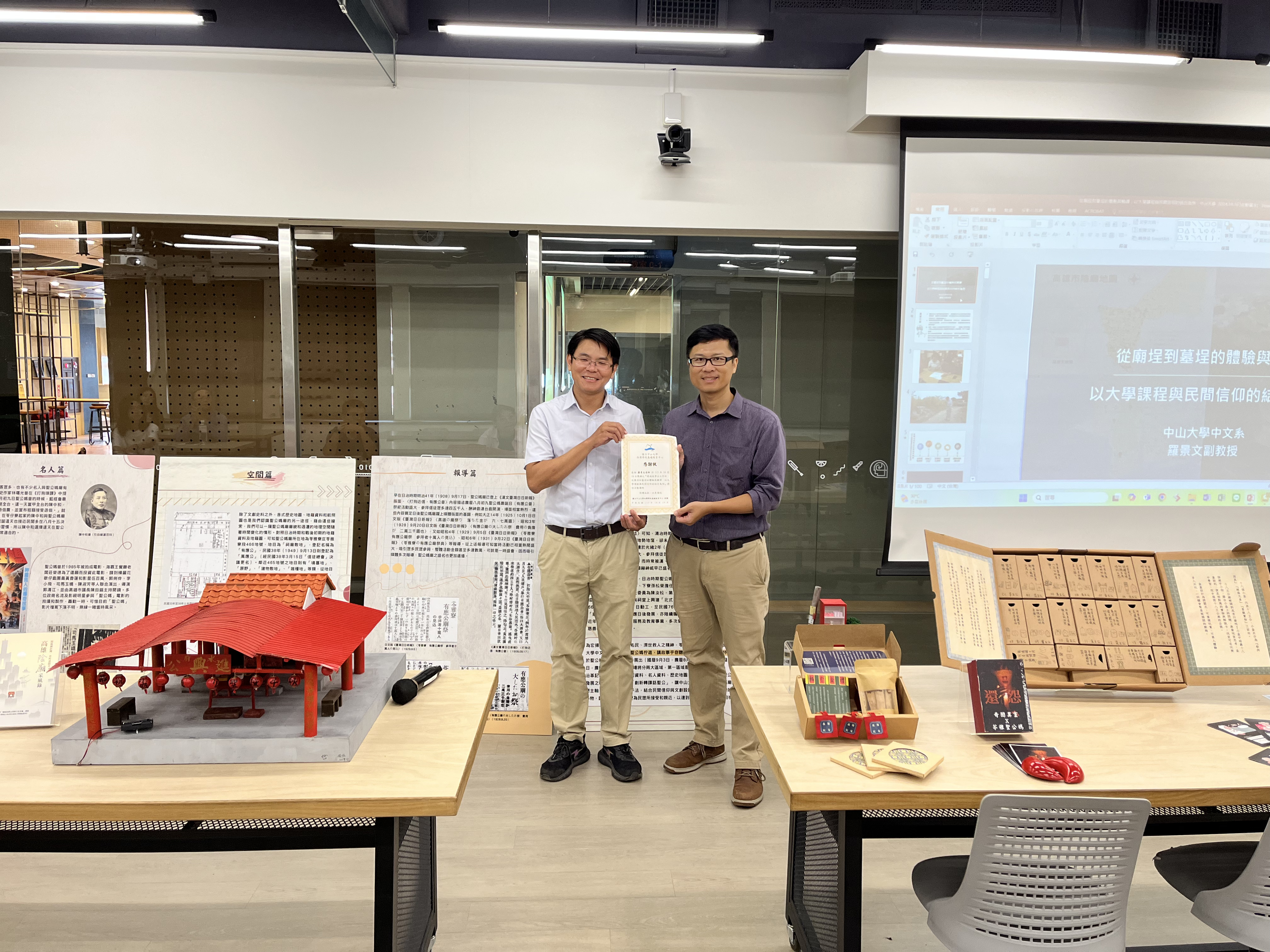 講座開場由基礎教育中心主任于欽平主持,羅景文則以詼諧輕鬆的方式切入,談論自身對於民間文學的興趣,分享如何透過田野調查、影像記錄和體驗式課程設計,讓學生親身參與宗教活動,深刻感受文化的豐富內涵。他指出:「傳統民俗信仰的核心在於日常生活的融入與無形規範」,如廟埕中的儀式禁忌與宗教象徵,他強調,學生往往對民俗信仰存有誤解或刻板印象,希望可以透過課程開設與設計,讓學生在實際體驗中更深入理解傳統民俗的意義、轉譯創新,建立尊重且多元的文化視野。講座現場羅景文特別帶來了多種實際的成果模型,例如廟埕模型、籤筒等。這些模型讓與會者不僅能以視覺與觸覺多重感官方式理解傳統文化,還能更具體地了解宗教活動的象徵意涵與背後蘊含的故事。