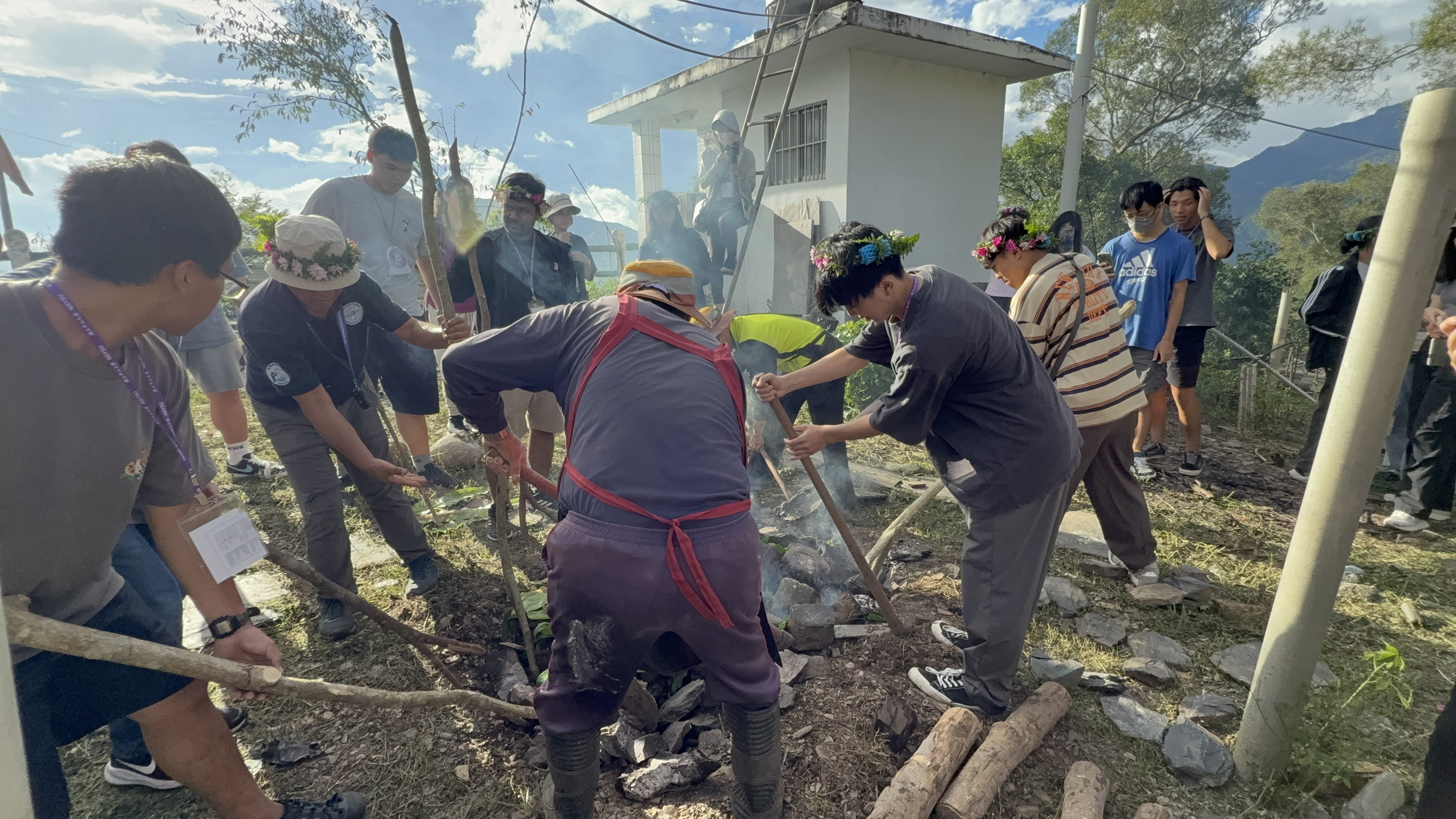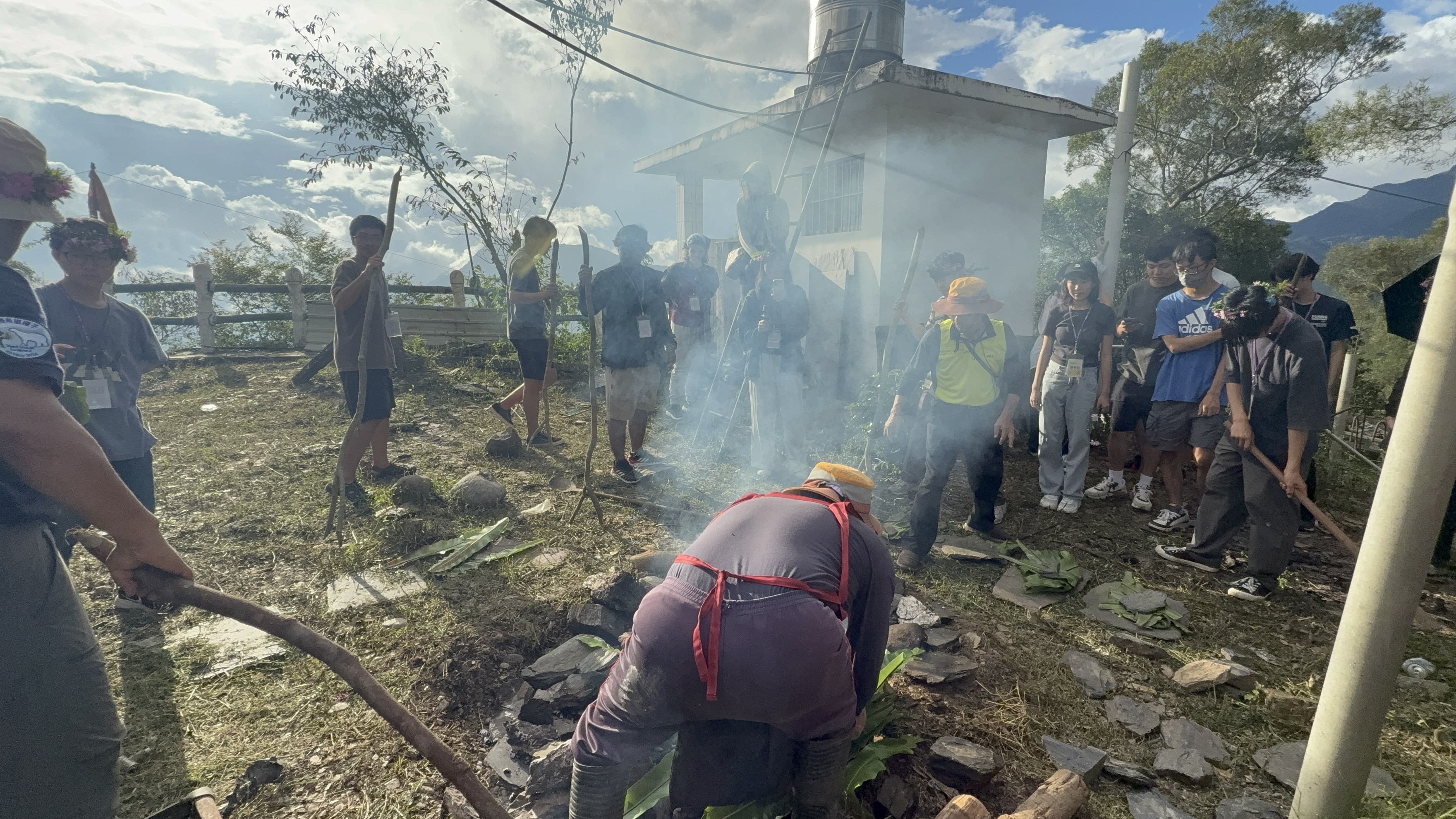 今年的儀式則首度破例,邀請所有學生一同參與。杜正吉主席親自解說占卜的文化意涵,並由巴山光前村長揭示大家的「來年運勢」。在耆老的指導下,學生們搬運石板、木材與植物,並在祈禱聲中正式展開祭儀。當石板逐漸燒得火紅、濃烈煙霧瀰漫時,學生們真切感受到傳統農耕與祭儀的莊嚴與不易。