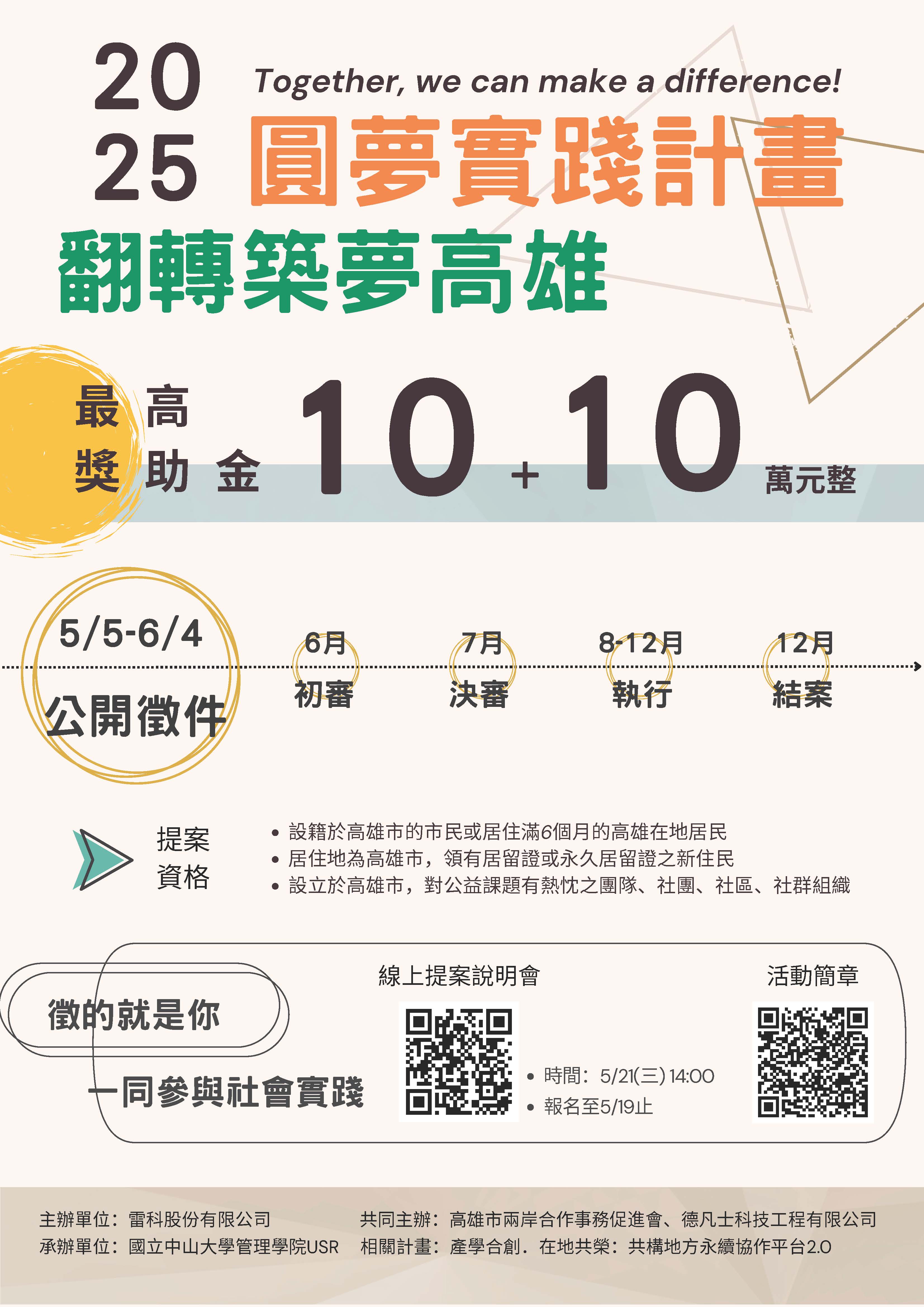 第五屆圓夢實踐計畫,持續以「翻轉築夢高雄」主題徵件,邀請高雄在地夥伴與團體以自主提案方式,響應聯合國永續發展目標(Sustainable Development Goals, SDGs)研擬特色行動方案,關懷高雄社會與公共議題,為地方永續盡一分心力。
