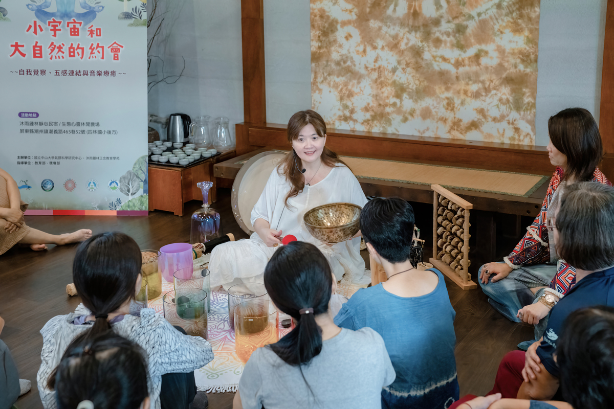 王家蓁說明,中山大學氣膠科研中心設有AeroMUSIC國際共學群,秉持有教無類、因材施教的教育理念,積極致力與社會各族群及單位團體合作,具體落實從內而外的全民永續發展教育。此次特別規劃「小宇宙與大自然的約會」系列工作坊,與長期推動永續綠生活實踐,且多次獲屏東縣「優良友善環境」首獎、環保永續經營獎等肯定的「沐雨鍾林生態心靈休閒農場」合作,期望人們能自發地採取守護行動,與大自然和諧共生,呼應由內而外的永續核心精神。