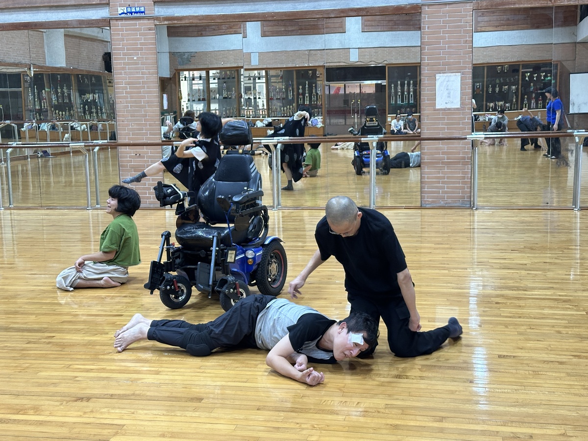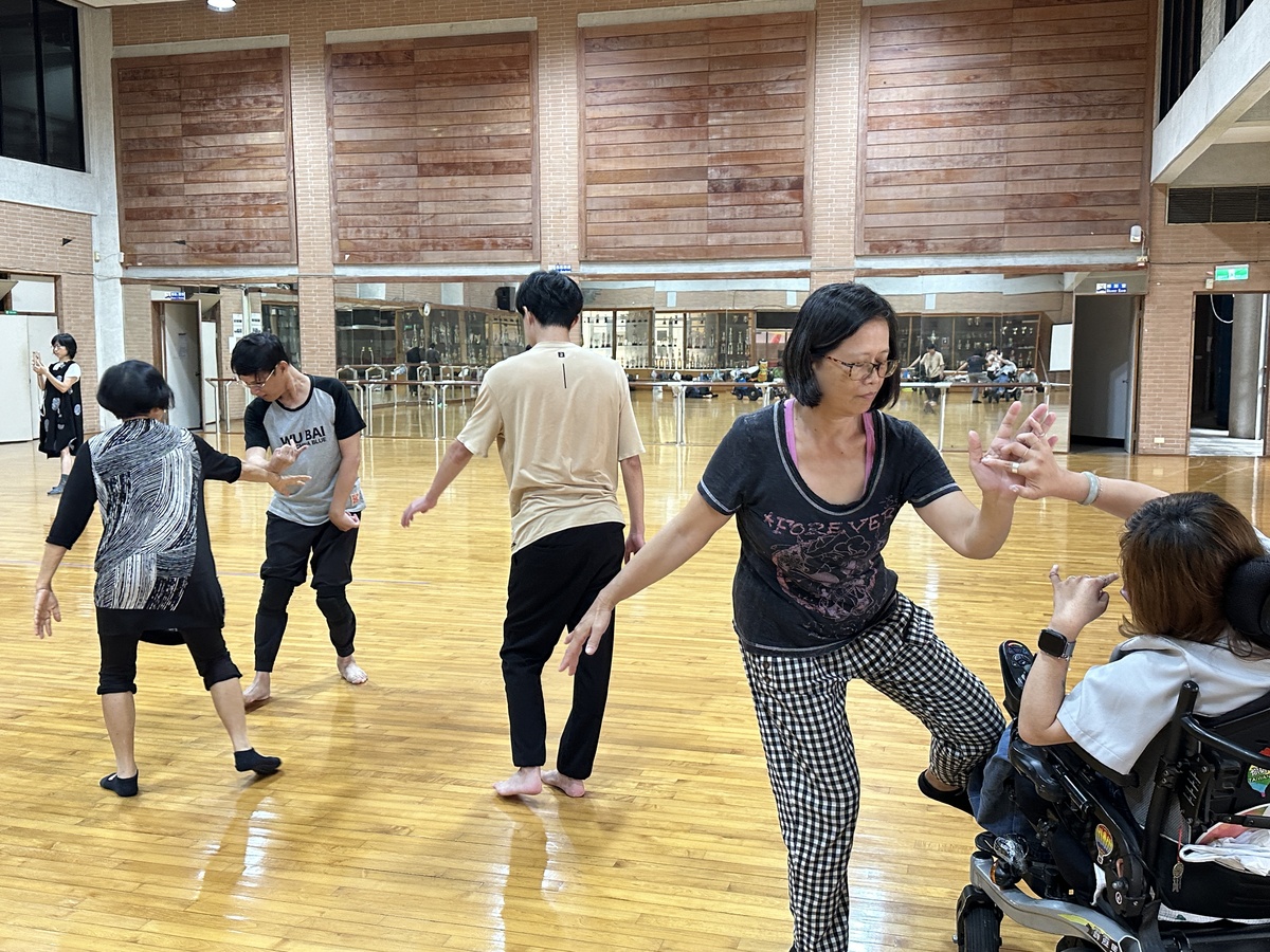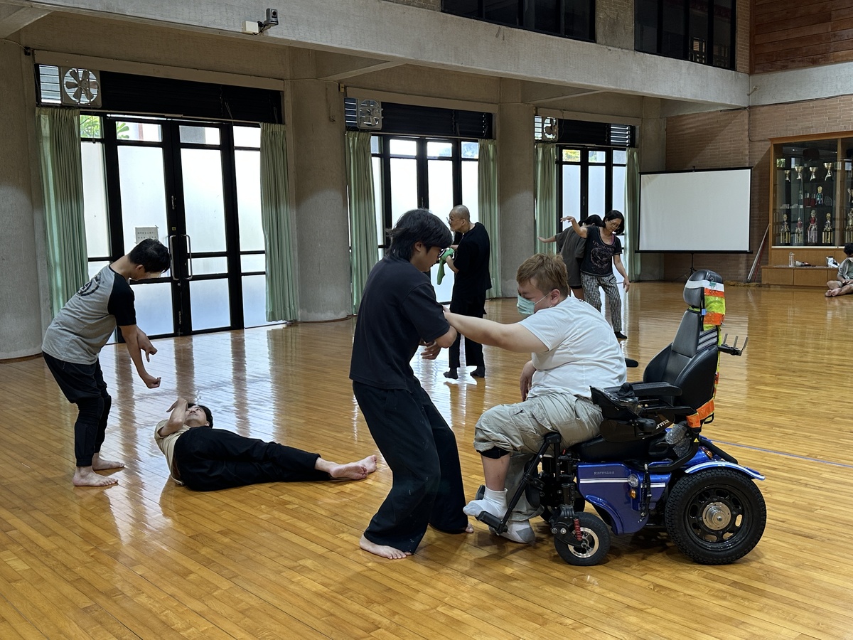姜聲國自2005年起以行為藝術與舞蹈為主要創作領域,長期推動障礙與非障礙者共融的身體實驗。此次設計的障礙藝術交流工作坊,不以技巧為核心,而是透過接觸與覺察,重新建立對身體與空間的敏感度。活動從地板暖身開始,學員透過緩慢移動、甩動四肢進入身體狀態,隨後展開雙人練習,嘗試用非手部的身體部位移動對方,重構「觸碰」的語言。