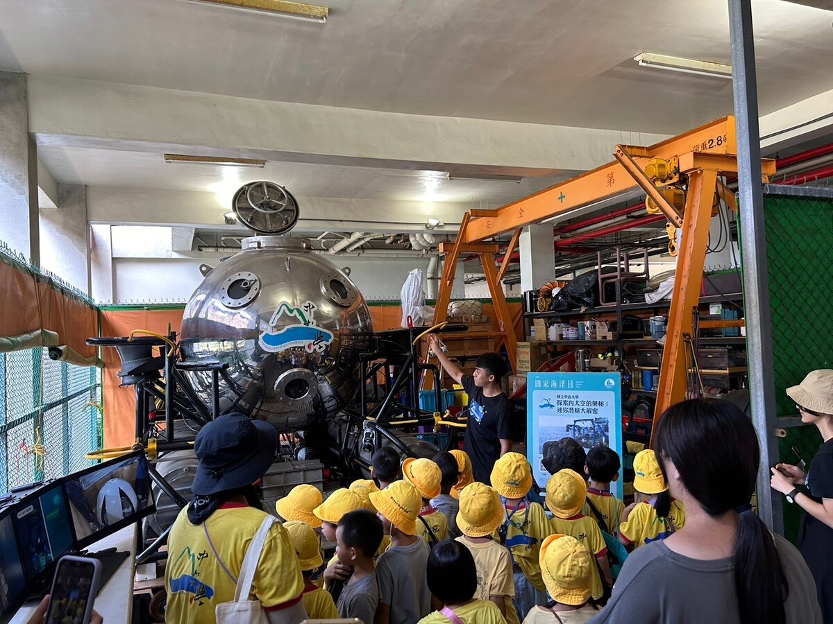 水下載具中心工程師帶領幼兒園孩童參觀水下載具,並解說載具外觀、造型與功能等。