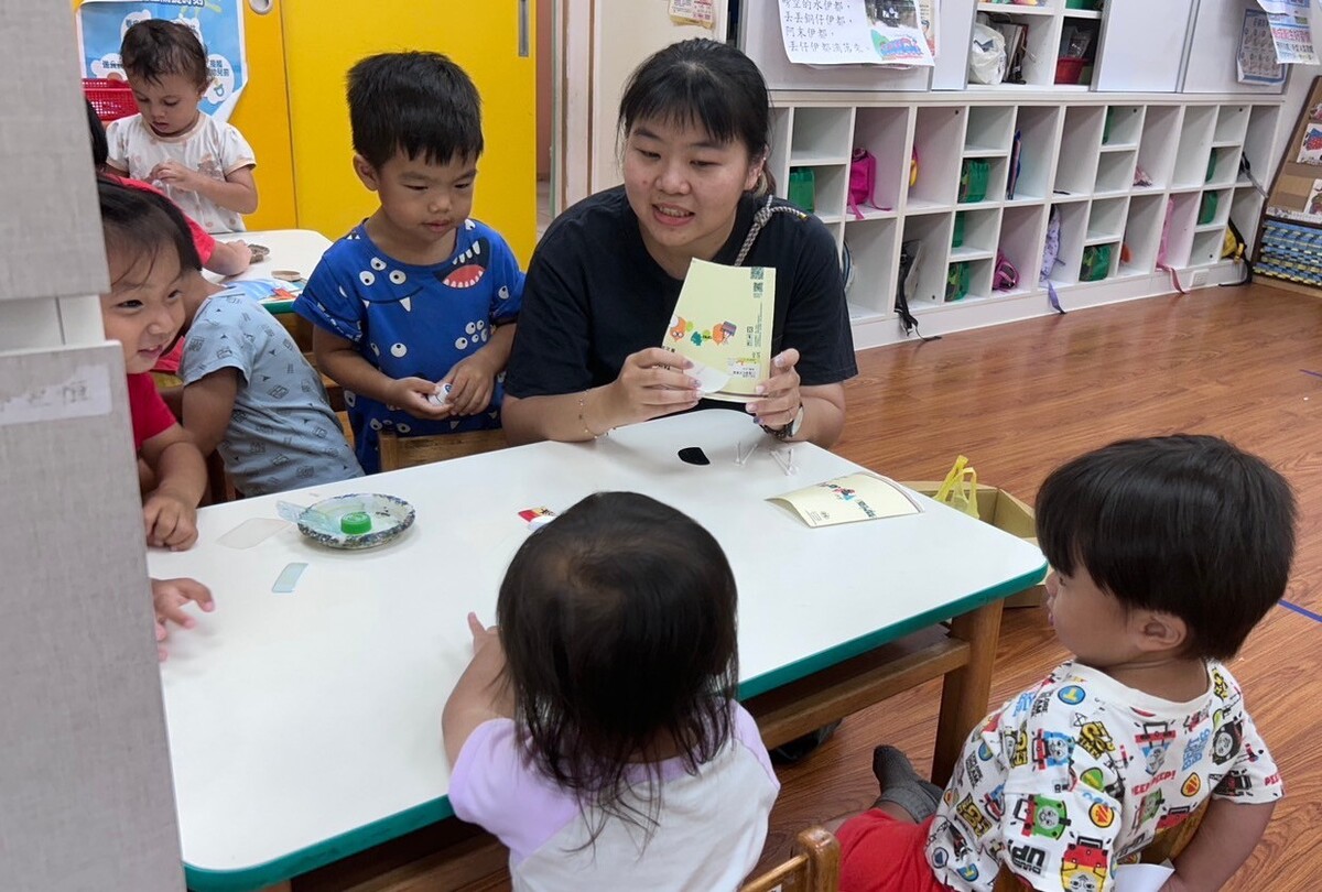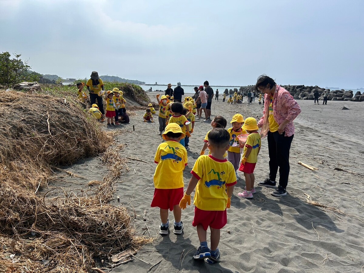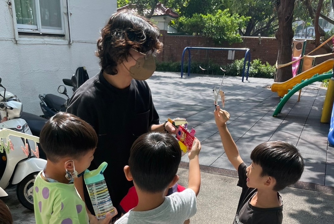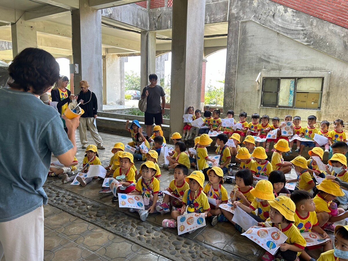 藝術家黃振峰與幼兒園孩童講解海廢的來源與故事,使孩童認知人類保育海洋的責任和使命。