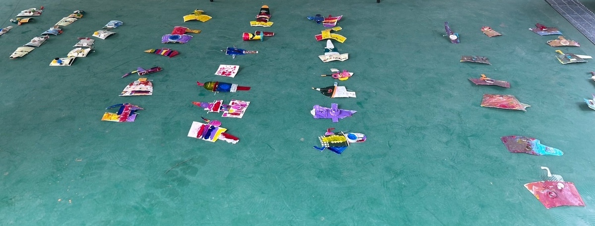 兩日的藝術教育推廣工作坊由「水下無人載具參觀」、「海洋廢棄物解說與撿拾」和「水下載具組裝及彩繪」三個部分建構而成。活動首先由載具研發中心工程師針對海底生物與水下無人載具,以淺顯易懂的方式向幼兒園孩童進行導覽,使學員對於海洋環境有進一步的了解;爾後,由藝術家黃振峰接續解說常見的海洋廢棄物(如保麗龍、寶特瓶、吸管、紙杯等),並在學員撿拾海廢的過程中,教導其透過簡單的垃圾分類,在日常生活裡落實環保行動,以此強調海廢再生之重要性。藝術家黃振峰將撿拾的海廢清洗乾淨後,帶至幼兒園引導學員進行載具組裝、彩繪,以培養孩童的造型認知與手眼協調能力為目標,協助學員完成獨屬自己的載具作品。這些作品如同一片海洋中容納各式獨具風格,有立體結構、也有色彩繽紛的平面載具,教學過程中也看見了孩童與生俱來的創意與創造力。