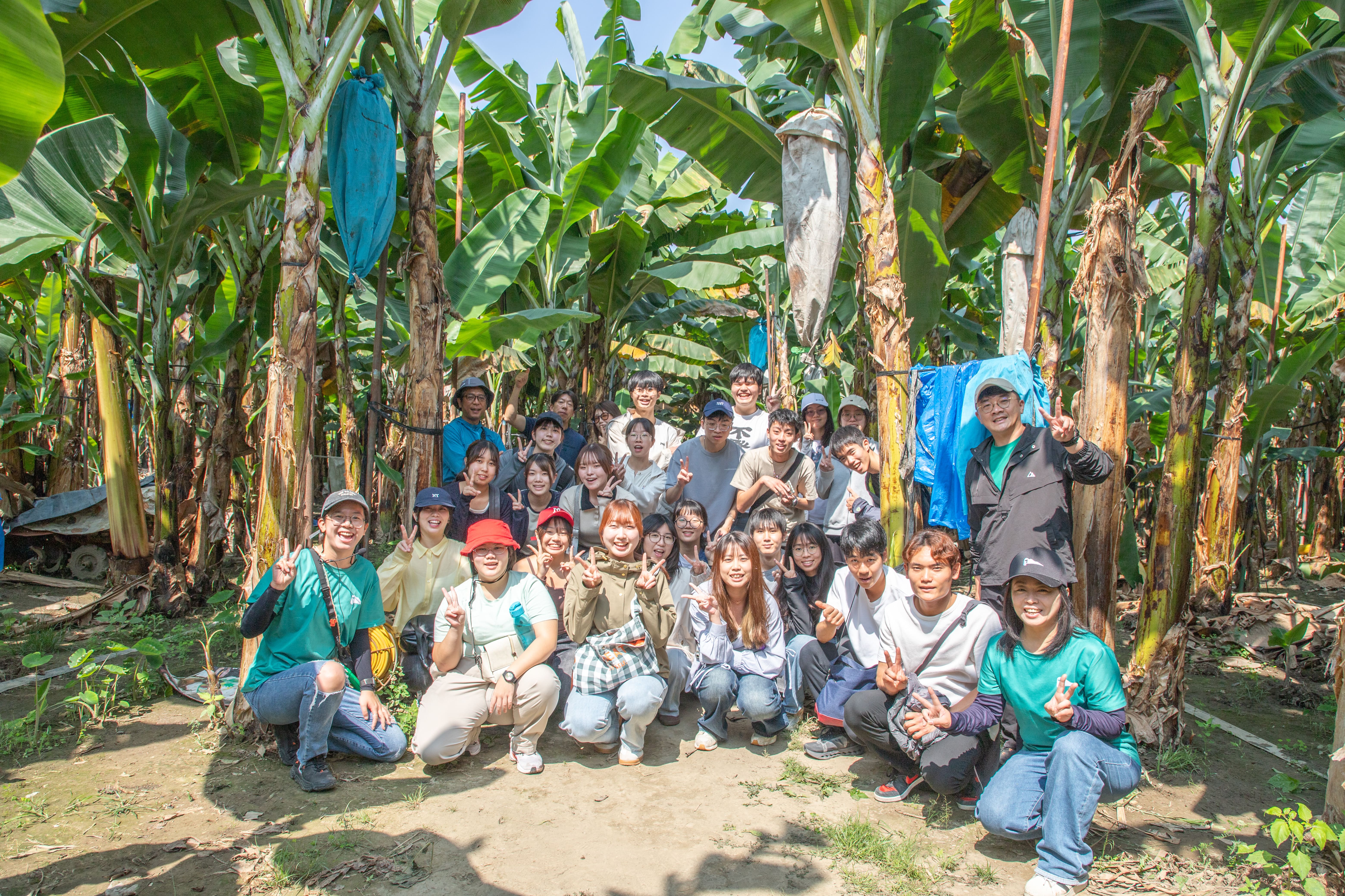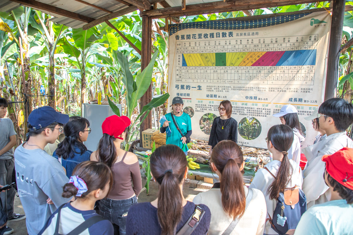 課程並移師旗山深化地方學習。USR城市共事館計畫與伊藤佳代特別邀請「金旗山城」創辦人郭俊宏,帶領學生走入香蕉園,透過專業導覽認識香蕉的生長環境與栽培方式。學生透過實地觀察與互動,理解香蕉產業背後所需的細緻管理與嚴格品質要求,以及其作為台灣重要外銷農產品的價值。