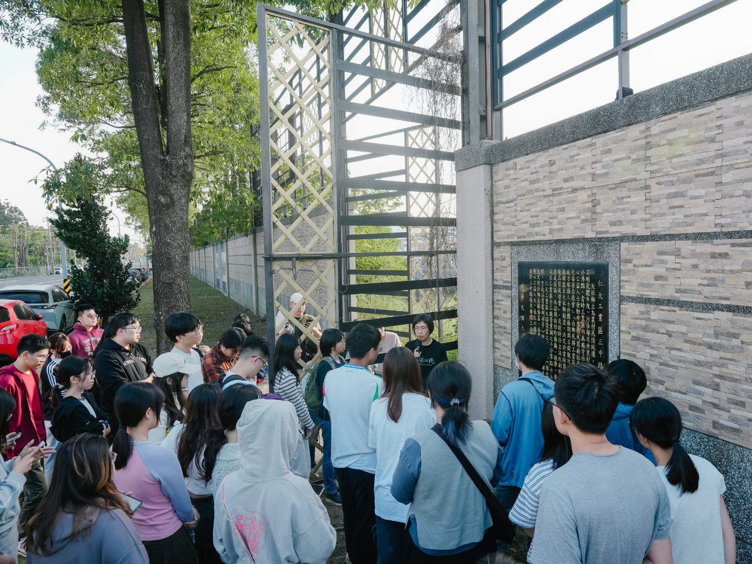 王敏玲帶學生走進「保護」後勁居民的工業綠帶,地上插著許多圓柱狀的監測孔,敏玲分享相比中油高高的煙囪,三四米高的圍牆和僅僅60公尺的工業綠帶,居民在家就能看到冒火的煙囪了;敏玲也說,當時汙染以深入土壤和地下水,整治過程也可能造成額外的汙染。例如,土壤雖然可以透過熱脫附的技術淨化,卻也有讓汙染回到空氣當中的風險。