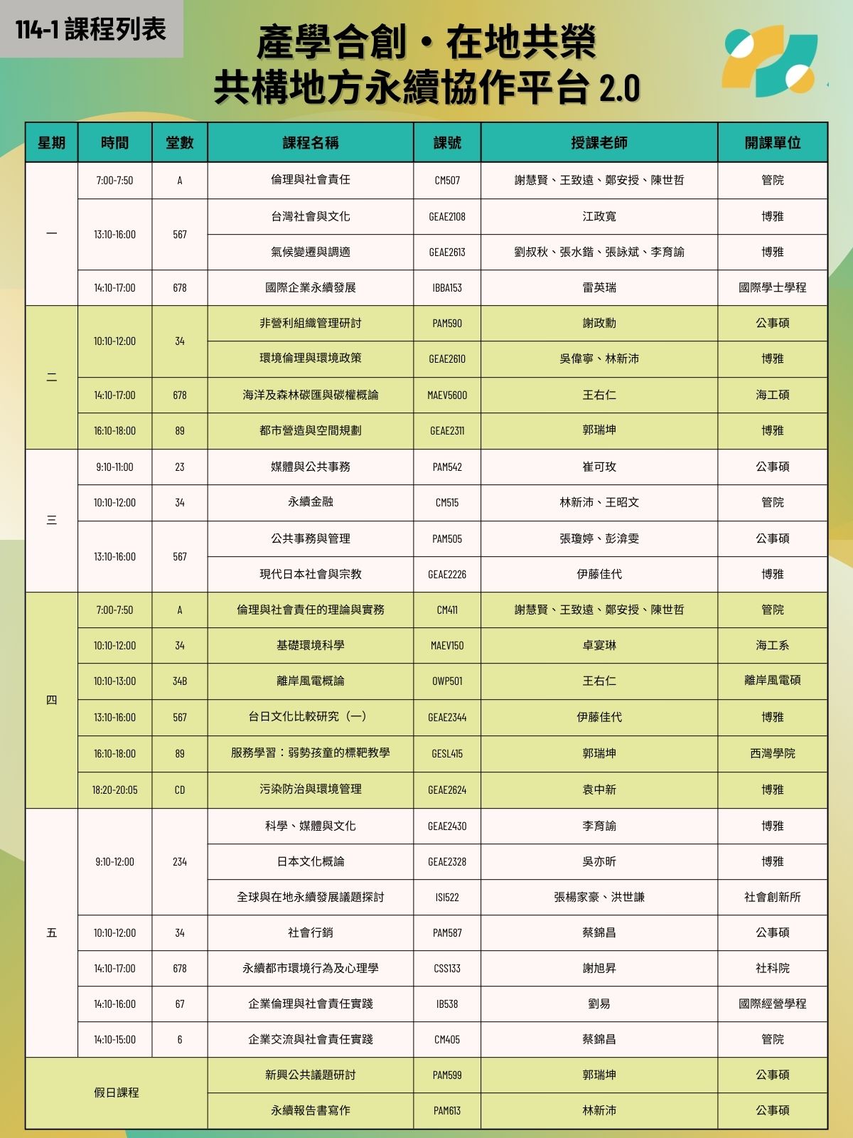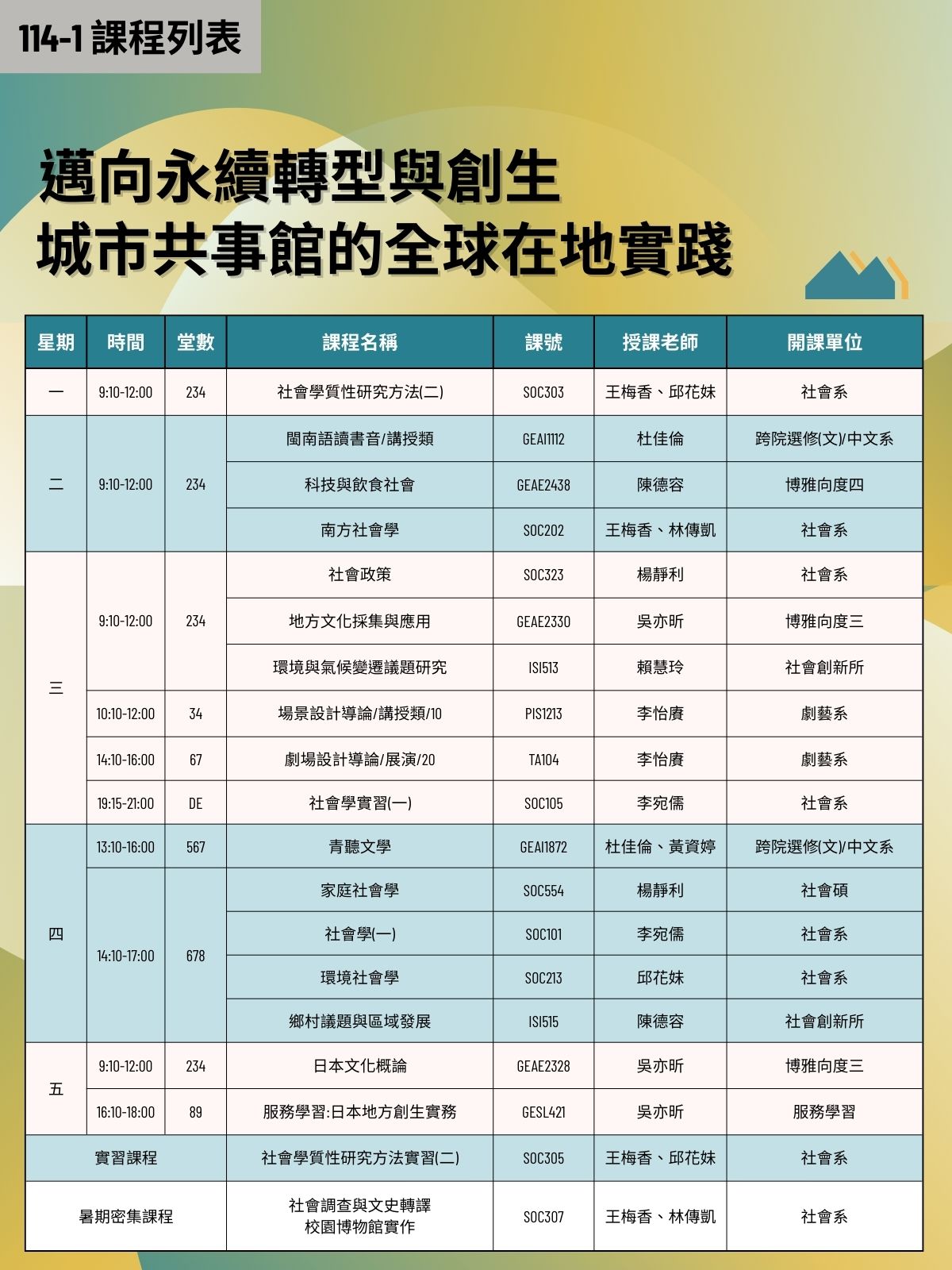 中山大學114-1學期社會實踐相關課程結合四項USR(教育部大學社會責任)計畫,提供更多元化的課程選擇,帶領同學們透過實務學習的方式,認識更多在地議題,共同實踐大學社會責任。在USR的課程中,大家不用只待在教室中聽講,更可以走出實際校園並關心地方場域,了解在地現況與需求同時銜接聯合國永續發展指標,透過課程培養更多社會實踐的觀察力與思考、解決問題能力與專業能力,讓大學生涯有更不一樣的學習經驗。