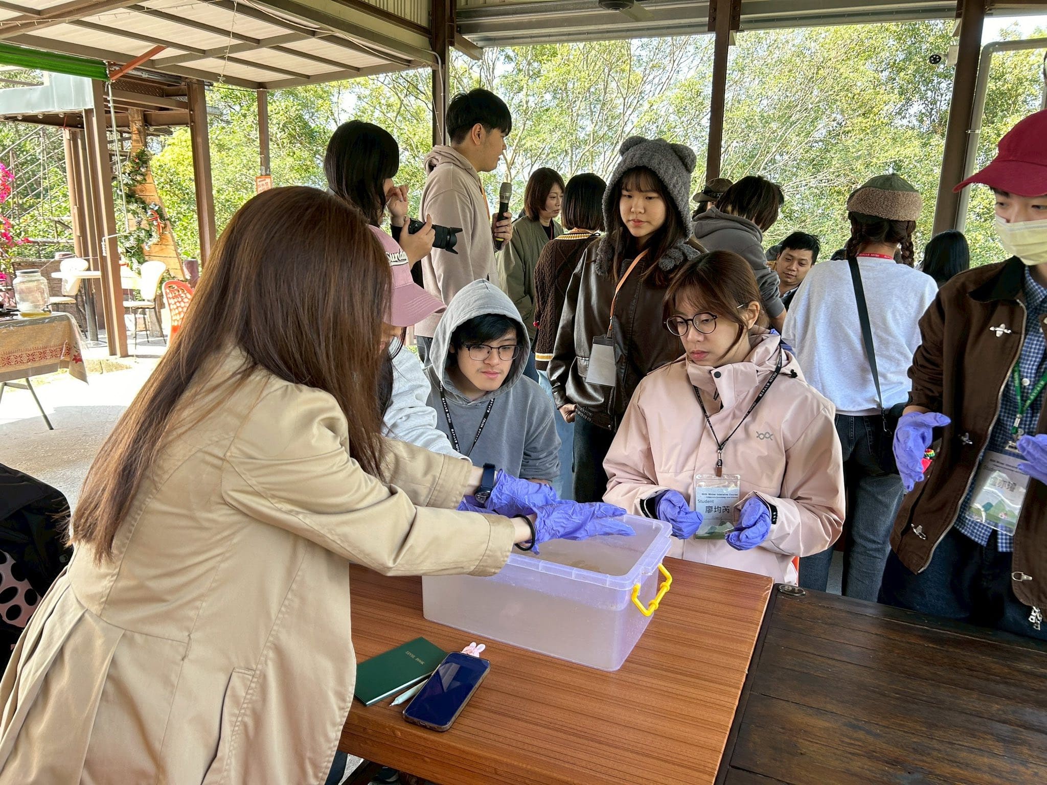 當天下午,學生也體驗以愛玉籽搓揉製作愛玉凍。透過老師的解說,學生理解愛玉與愛玉小蜂之間的共生關係,以及臺灣特有的地理環境如何孕育出這樣的生態智慧。從料理到甜品,學生不僅品嚐食物,更透過雙手理解文化與自然之間的連結。