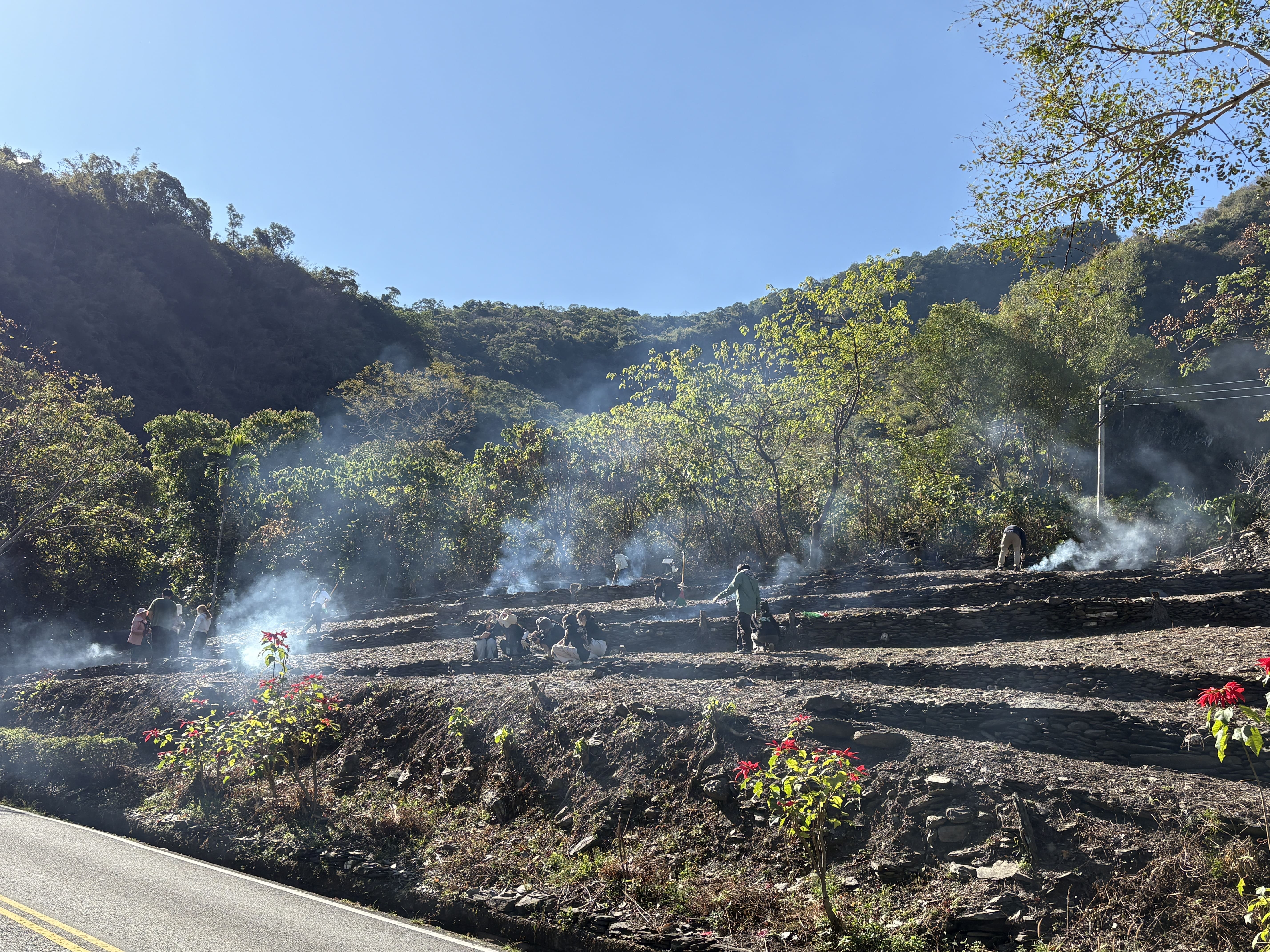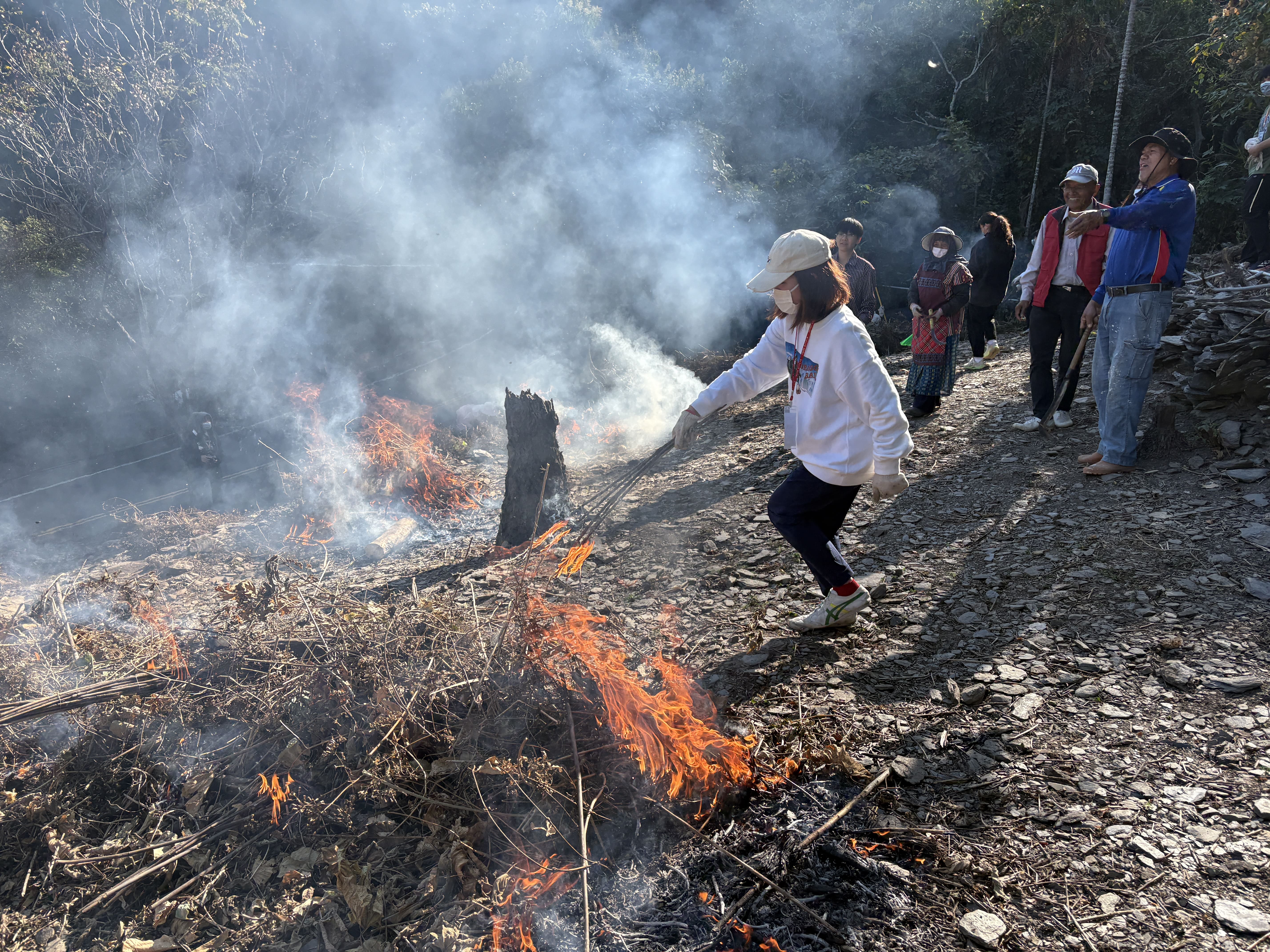 在族人賴天民老師、杜進德老師與部落媽媽們的指導下,學生承接前期整地成果,正式點火進行燒墾。煙霧在田間緩緩升起,也象徵沉睡多年的傳統農耕記憶再次被喚醒。族人示範如何利用掃把集中餘燼、控制火勢,讓學生理解燒墾並非單純燃燒,而是一套蘊含經驗與智慧的土地管理方式。整地完成後,趕在春雨來臨前,部落會接續播下作物種子,期待今年迎來豐收。