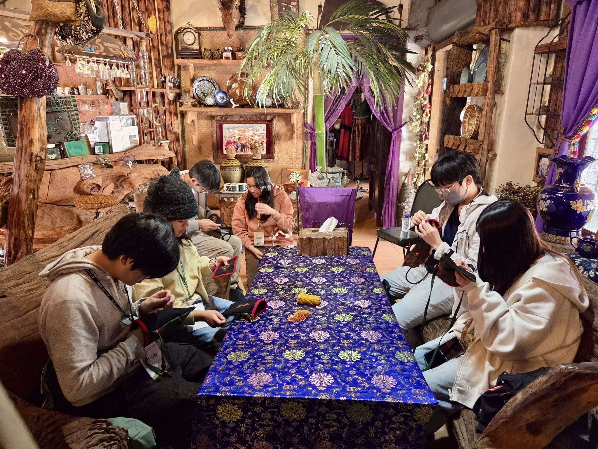 第四天的課程則走入族人家中,透過手作與穿戴體驗文化日常。在丁秋英老師的帶領下,學生學習魯凱族傳統的十字繡技法,並在布面上繡出屬於自己的圖樣。老師介紹魯凱族文化中象徵意義深遠的三種顏色:紅色代表太陽、黃色代表人民、綠色代表土地。學生在選擇線色與圖樣的過程中,也逐漸理解這些符號背後的文化意義。