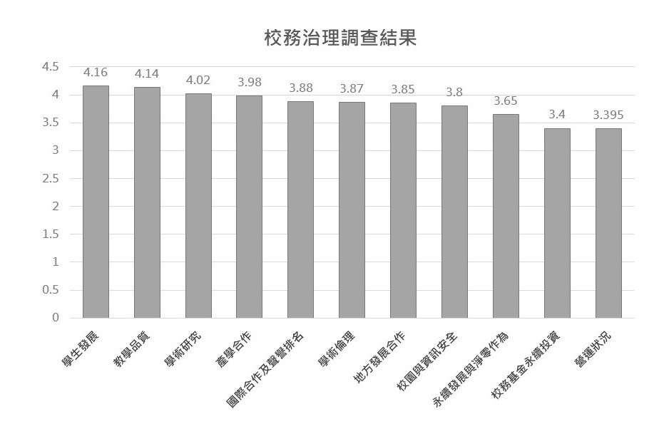 整體調查內容,主要分為「校務治理」「ESG永續發展目標」以及「永續策略」三個部分,當中有不同細項內容讓利害關係人根據個人的關注程度進行填答。在校務治理項目調查中,「學生發展」以4.16分位居首位,「教學品質」(4.14分)及「學術研究」(4.02分)分列第二、三名,突顯學生升學與就業發展、教學品質持續優化,及學術研究的創新議題備受關注,反映出社會對教育本質日益提升的重視;另有「產學合作」以3.98分排名第四,呈現本校積極推動與產業鏈結,培育具備實務能力的專業人才的努力;「國際合作及聲譽」和「學術倫理」的評比分別強調出中山在全球交流及研究誠信方面的表現,獲得利害關係人的高度關注。雖然就關注主題的程度略有不同,但整體關注的調查結果相當平均,突顯出校務治理兼顧各個層面,全面性備受關注與期待。