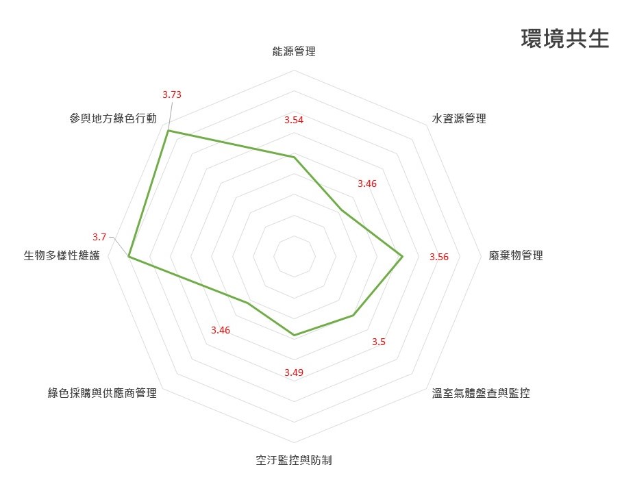 在「ESG永續發展目標」中共區分為環境、社會、治理三個面向,針對三個面向之下不同議題推動的關注程度進行填答。環境面向中「綠色行動」、「生物多樣性」和「廢棄物管理」獲得關切,反映出全球對氣候變遷和生態保護重視提升。社會面向則以「友善校園」、「消除不平等與高教公共性」和「多元入學」為焦點,呼應社會對公平與包容性日益增加的需求。治理面向中,「永續國際連結」、「永續相關之在地合作」和「永續相關之校園實踐與推廣活動」也充份展現中山積極推動永續發展,透過國際連結、在地合作及校園實踐,呼應全球趨勢化下利害關係人對永續交流的重視與關注。