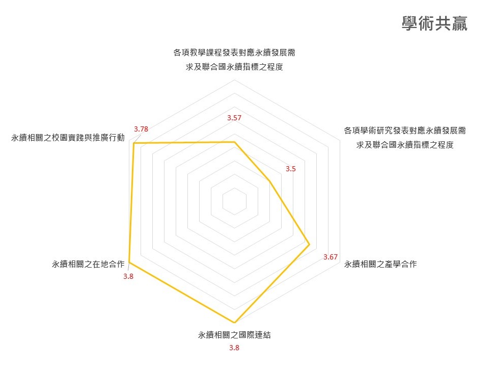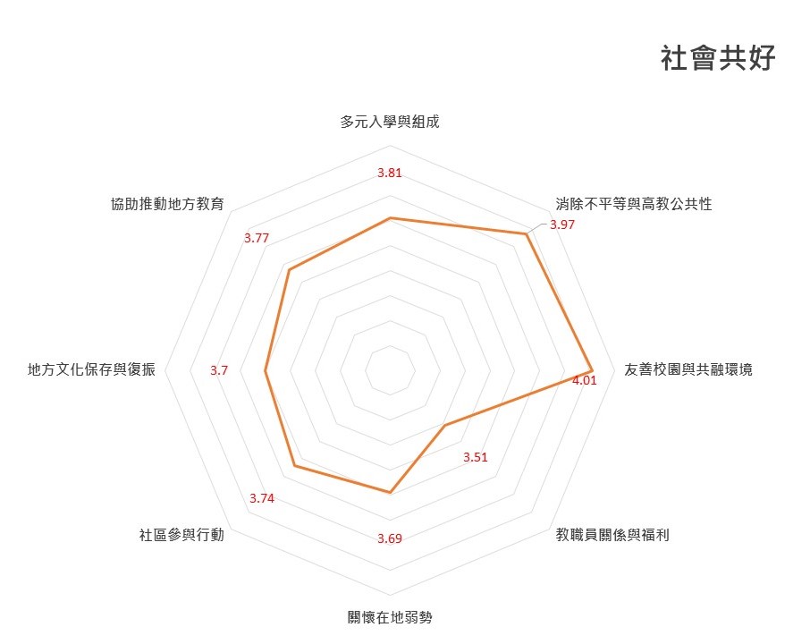 整體而言,在ESG各項推動指標上,關注度最多的主要落在社會共好中的友善校園、消除不平等以及多元入學,以及在治理作為中,擴大與永續相關外部合作,包含國際連結、在地合作以及實踐推廣行動。反映了填答者環境、社會、學術治理三個面向中,首要對於社會人文與實踐行動上的關注。