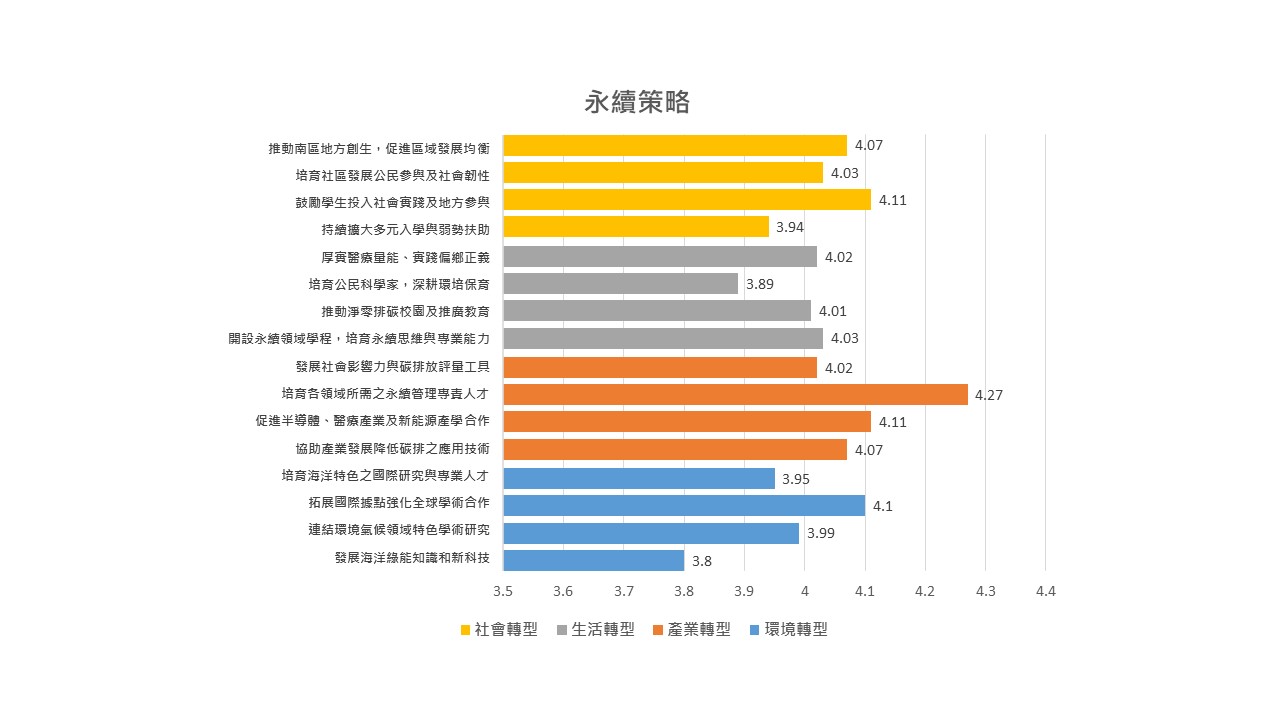 最後在「永續轉型策略」上,填答者依序對於產業、社會、環境及生活轉型四大策略有不同的關注角度。在產業轉型方面以培育各領域永續管理專才(4.27分)與促進半導體、醫療及新能源產學合作(4.11分)為焦點,說明中山在提升學生競爭力並促進產學連結的關切;生活轉型則聚焦於培育永續思維和專業能力(4.03分)和厚實醫療量能、實踐偏鄉正義(4.02分),透過教育與政策提升社會大眾的環保行動力,進而落實低碳生活;環境面向,拓展國際據點強化全球學術合作(4.1分)和連續環境氣候領域特色學術研究(3.99分)反映出對全球生態議題共同關注;社會轉型,則偏重社會實踐(4.11分)和區域創生(4.07分),展現對地方發展、社會共融的期盼。