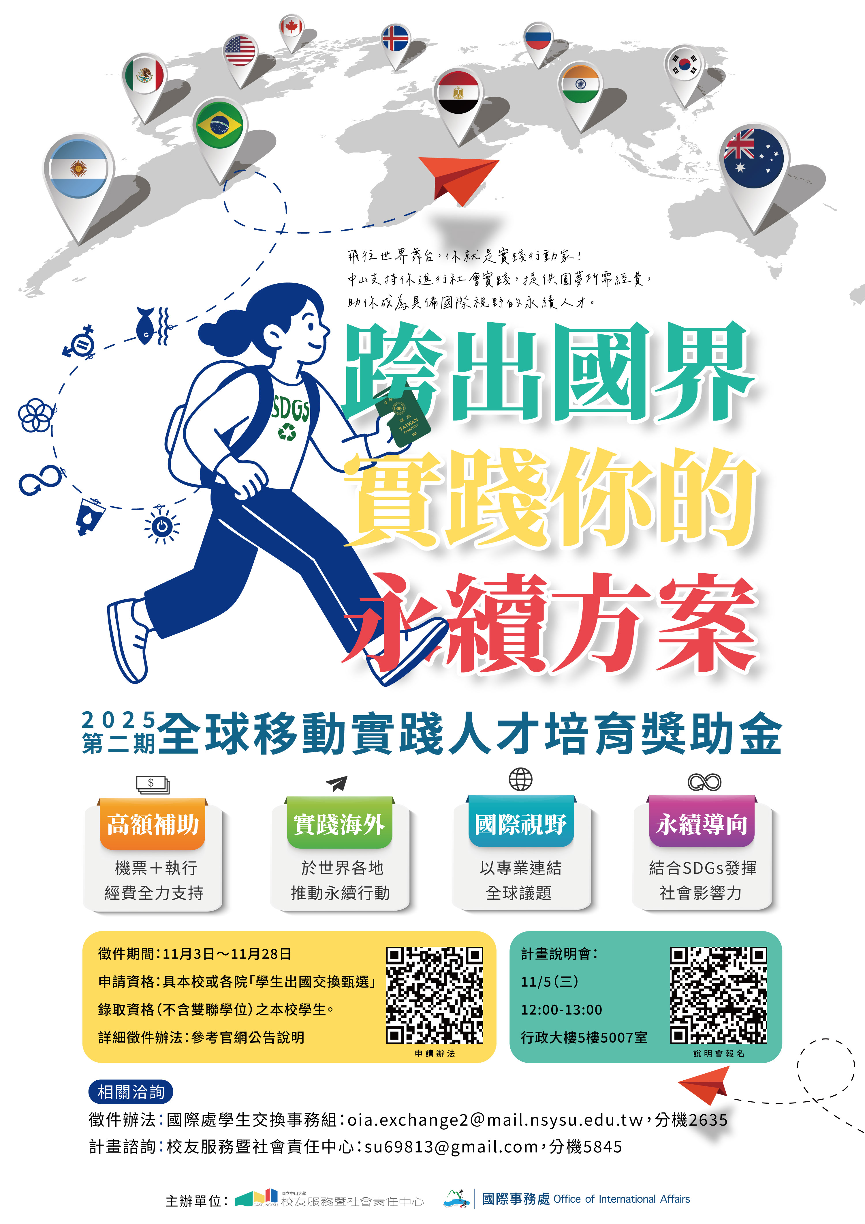 同時,「全球移動實踐人才培育獎助金」也正熱烈徵件中,由校友捐資、校友服務暨社會責任中心與國際處共同推動,鼓勵學生在海外交換期間勇於提出社會實踐計畫。中山社會實踐團隊也將持續上山下海、跨域協作,讓更多的永續故事在校園內外不斷延續。