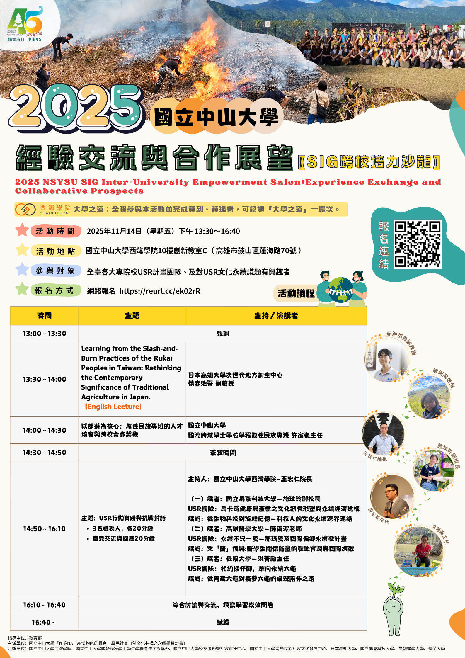 邀請全臺各大專院校USR團隊與中山師生齊聚,交流行動經驗與反思,共同思考:當地景與人相遇,如何讓教育、文化與永續在偏鄉生根發芽?